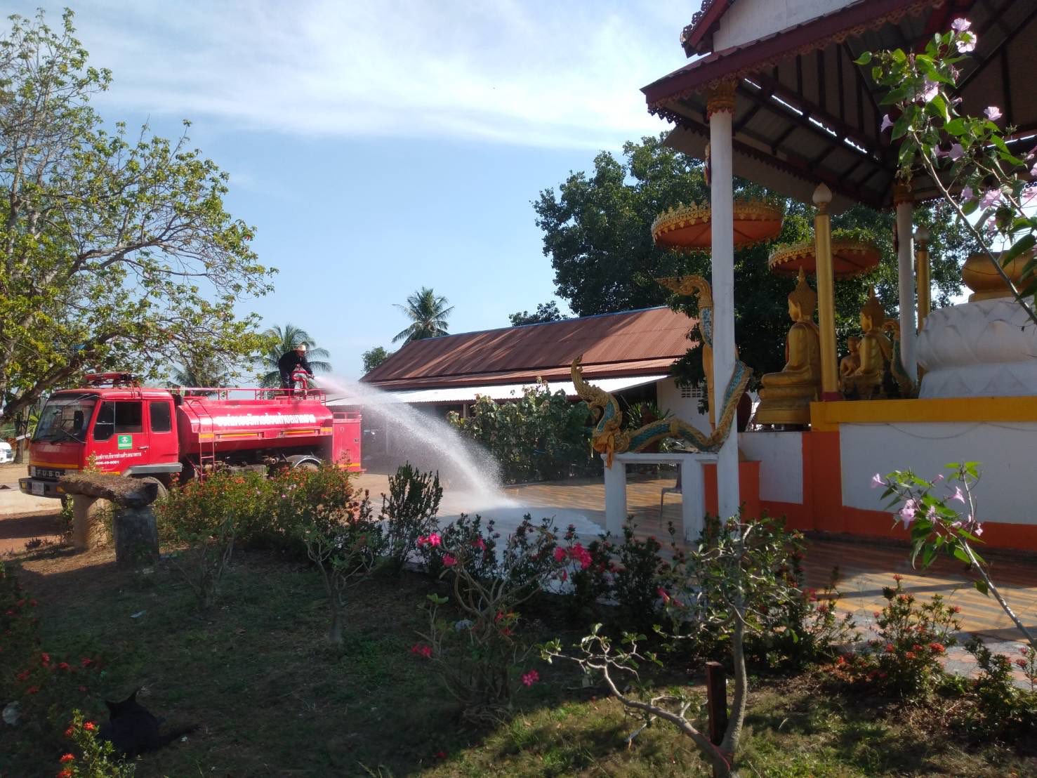 งานป้องกันฯ นำรถดับเพลิงออกให้บริการน้ำ ฉีดล้างทำความสะอาดภายใน และภายนอกรอบบริเวณโบสถ์ วัดวารินดำรงค์ �...