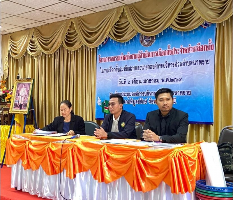 นางสาววาสนา ดำโดด ผู้อำนวยการกานเลือกตั้งประจำองค์การบริหารส่วนตำบลนาทราย พร้อมด้วยคณะกรรมการการเลือกตั้งประจำองค์การบริหารส่วนตำบลนาทราย และพนักงานส่วนตำบล จัดโครงการอบรมเจ้าพนักงานผู้ดำเนินการเลือกตั้งประจำหน่วยเลือกตั้ง