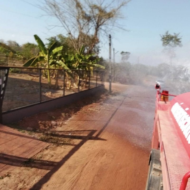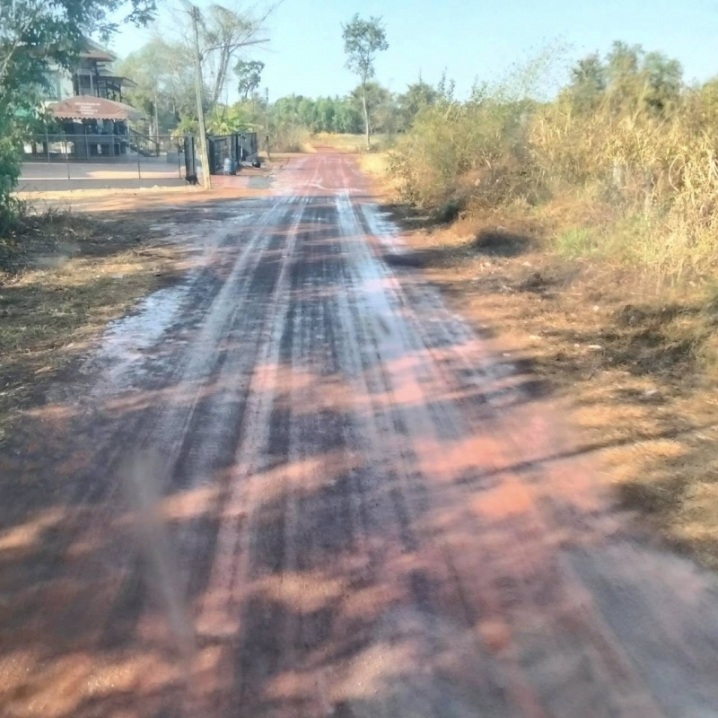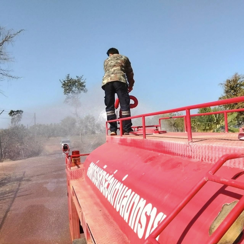 งานป้องกันฯ น้ำรถดับเพลิงออกให้บริการฉีดน้ำรดถนนลูกรัง เพื่อบรรเทาความเดือดร้อนจากฝุ่นละออง บ้านหนองไผ่ หมู่ที่ 8