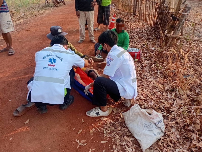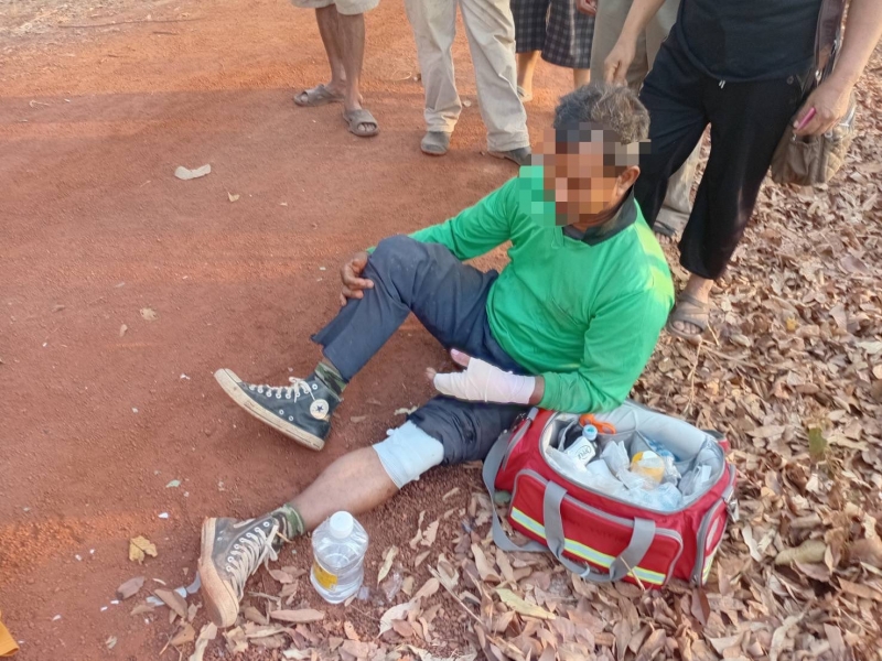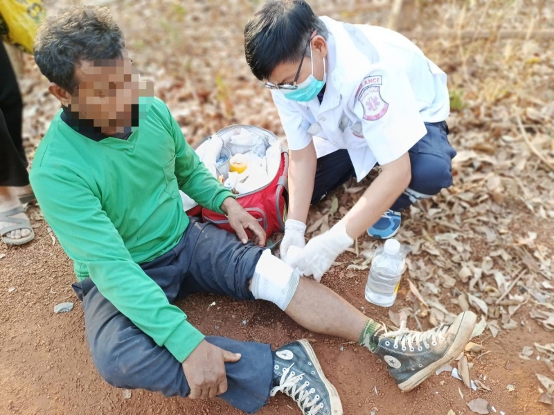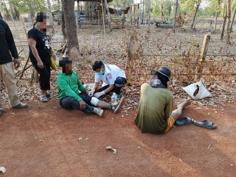 - รายที่1 เป็นชาวบ้านถ่อนนาเพลิน อายุ57ปี มีบาดแผลที่หัวเข่าด้านซ้ายลึกประมาณ1ซม.ยาว10 ซม. และเจ็บที่ข้อมือด้านซ้าย