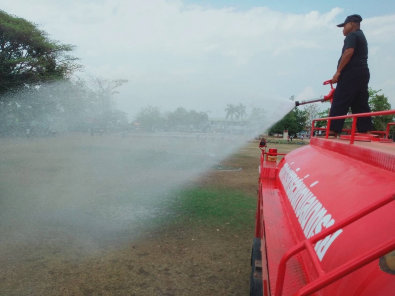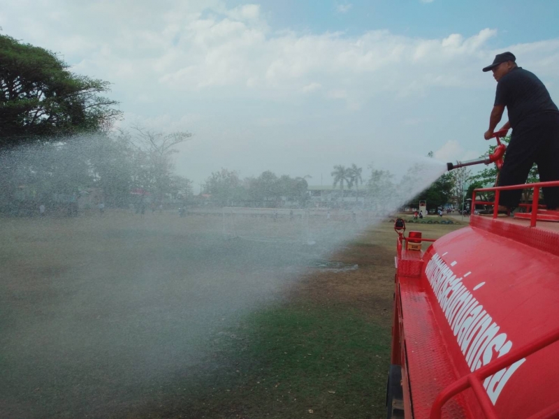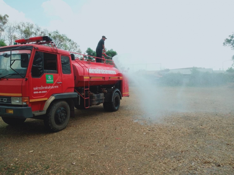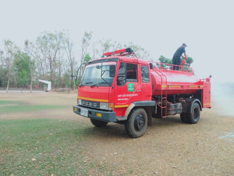 งานป้องกันฯ นำรถดับเพลิงออกให้บริการฉีดน้ำรดสนามฟุตบอล โรงเรียนบ้านถ่อนนาเพลิน