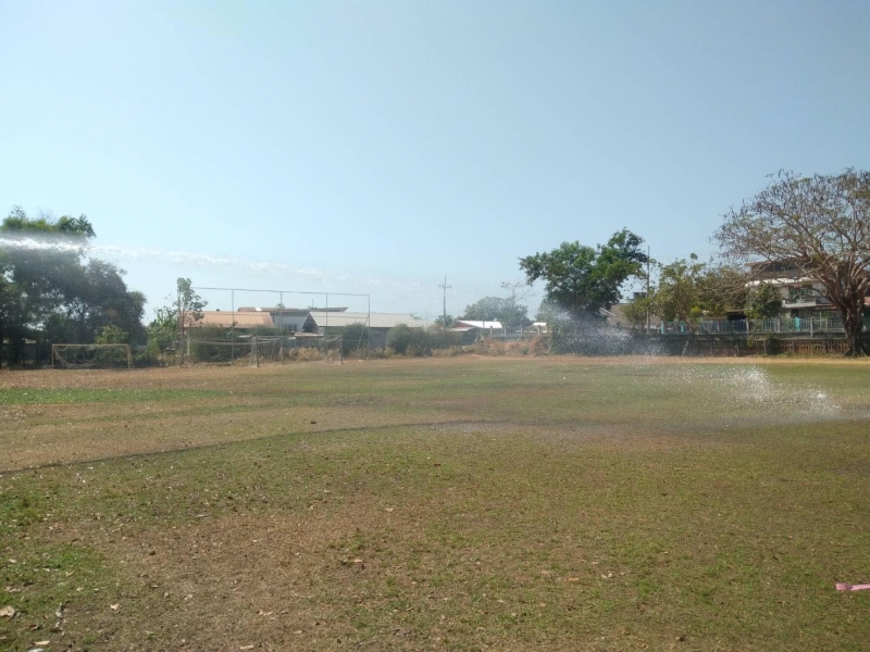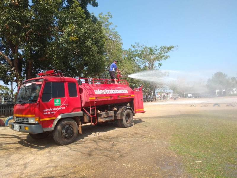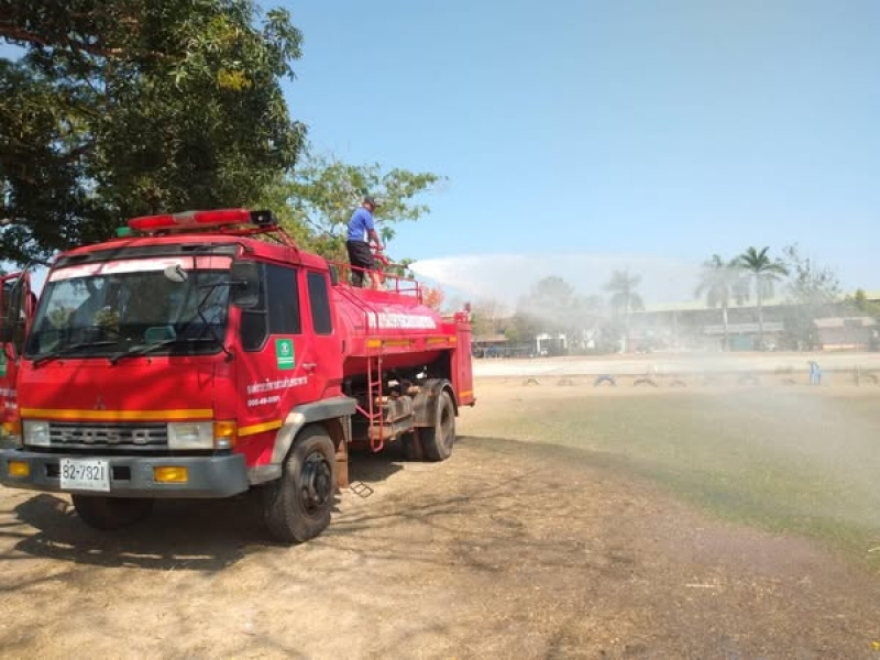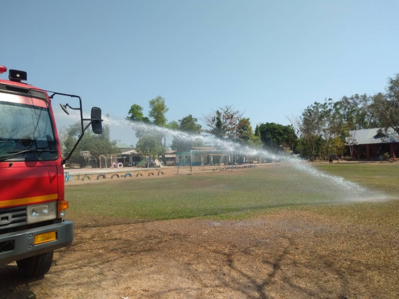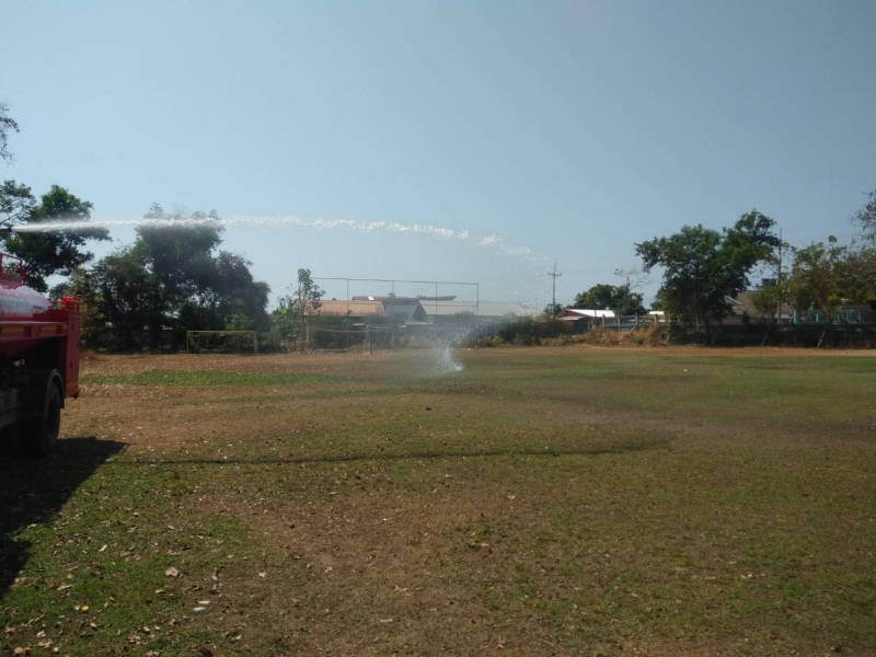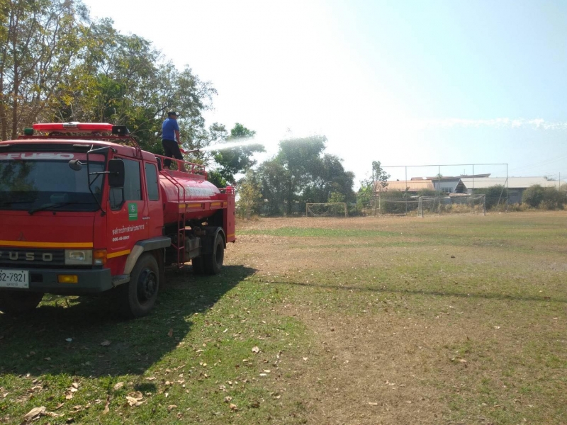 งานป้องกันฯ นำรถดับเพลิงออกให้บริการฉีดน้ำรดสนามฟุตบอล โรงเรียนบ้านถ่อนนาเพลิน