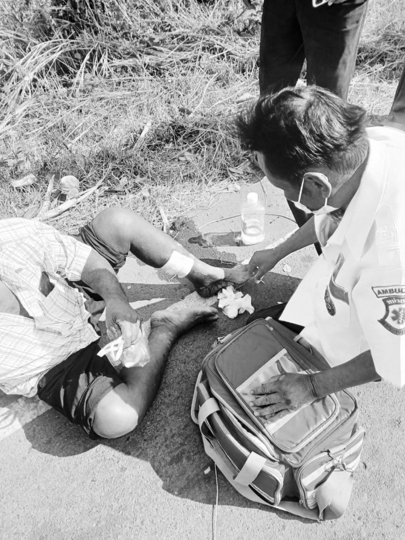 ศูนย์บริการแพทย์ฉุกเฉิน อบต.นาทราย ได้รับแจ้งจากศูนย์สั่งการให้ออกรับผู้บาดเจ็บจาก หกล้มใส่ที่พักเท้าจักรยานยนต์ ที่หมู่11 บ้านมีชัยพัฒนา พบเป็นชาย1รายอายุ77ปี มีบาดแผลที่ขาซ้าย ลึกประมาณ3-4 มม.ความกว้างของแผลประมาณ1นิ้ว
