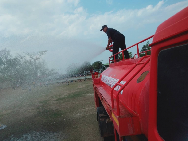งานป้องกันฯ นำรถดับเพลิงออกให้บริการฉีดน้ำรดสนามฟุตบอล โรงเรียนบ้านถ่อนนาเพลิน