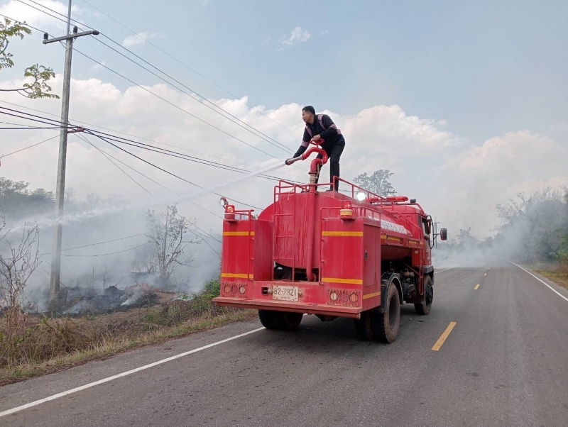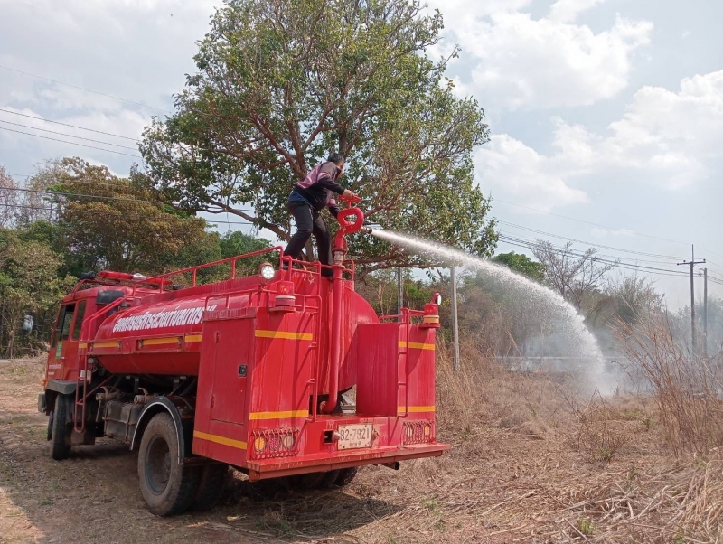 งานป้องกันฯ ออกให้บริการฉีดล้างถนนเพื่อลดฝุ่นละออง บ้านถ่อนนาเพลินหมู่ที่ 7
