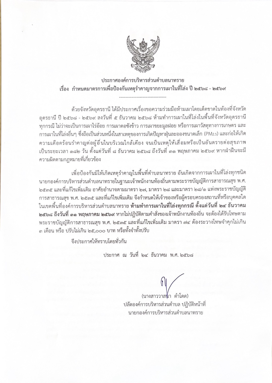 ประกาศองค์การบริหารส่วนตำบลนาทราย เรื่อง กำหนดมาตราการเพื่อป้องกันเหตุรำคาญจากการเผาในที่โล่ง ปี 2568-2569 |